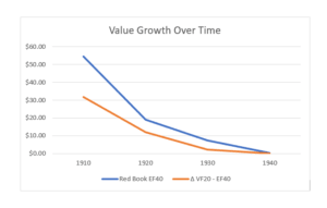 The third thing that sticks out is that the value and volume of retired coins in any condition continue to increase over time. For the sake of this section, I would like to focus on the coinage, with my attention on the Lincoln Wheat penny. History seems to tell us that coins, not including minting defects (which have their own value dynamics), become valuable to a coin collector after 100 years in circulation. Life expectancy for any coin is estimated to be around 30 years, with circulation control as a passive function by population hoarding, collecting, saving, neglect, and loss. In another simple analysis of Wheat pennies from 1910 to 1920 graded at EF40 using the (Sheldon Grade) condition criteria, the average 2023 red book price for these coins is about $54.63/penny. Upon further analysis, the Lincoln Wheat of the 1920s has an average red book price of $18.96/penny for the same EF40 grade, with the 30s at $7.32/penny and the 40’ coming in around $0.37/penny. In the graph below, you can also see I have charted the average prices of Lincoln Wheat for the VF20 for the same time periods. In general, I think the data shows us that at a certain point, after each decade passes, the value of a coin tends to go up exceptionally. The same dynamic is also true as you look at the delta difference between a VF20 and an EF40 of the same penny; the 1910s show an average delta of $31.88/penny, the 20s at $11.88/penny, the 30s at $2.14/penny with the’40s at $0.15/penny. As with time, the delta also becomes more significant between grades.
